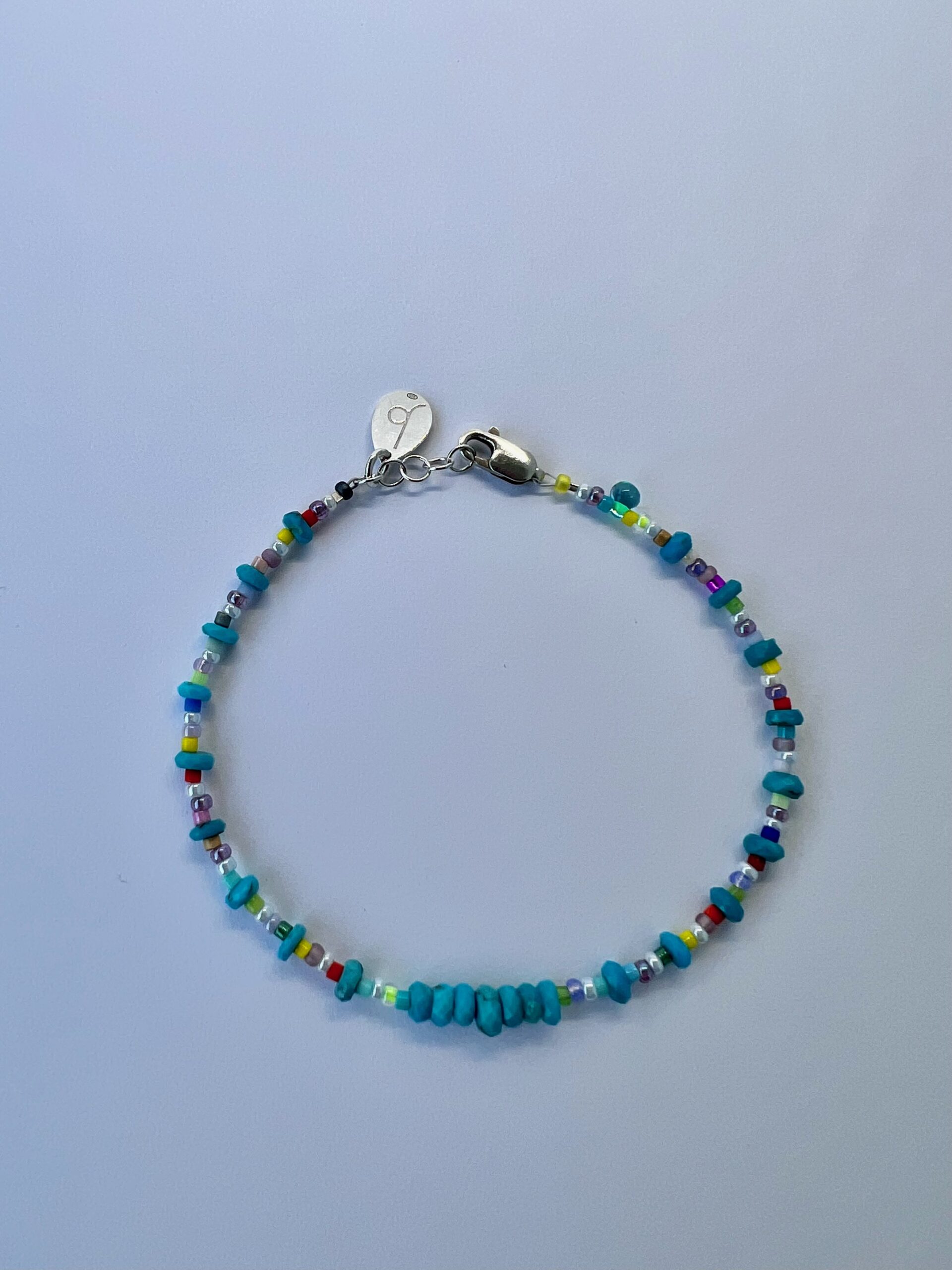 Bringen Sie Farbe in Ihren Alltag! Lassen Sie sich von dem frischen Mix aus Türkis und bunten Natursteinen begeistern. Sichern Sie sich dieses handgefertigte Unikat für Ihren nächsten Strandurlaub oder als täglichen Lichtblick. Legen Sie Ihr Beads Armband farbig mit türkisen Rondellen jetzt in den Warenkorb!